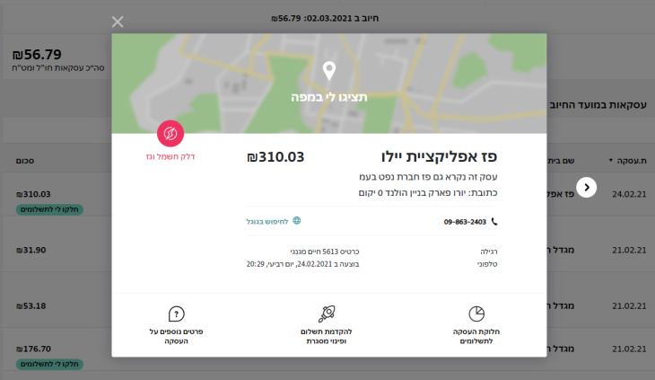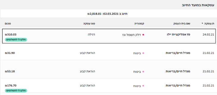 1. מתוך פירוט החיובים, בוחרים עסקה ולוחצים על הכפתור "חלקו לי לתשלומים":
