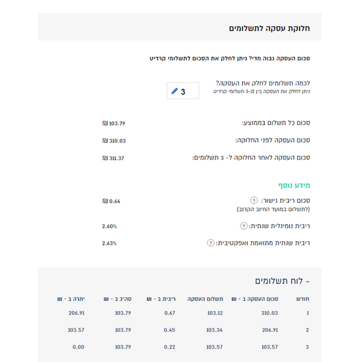 בין 3-18 תשלומים, תלוי בסכום העסקה המקורית, מינימום 25 ₪ לכל תשלום.